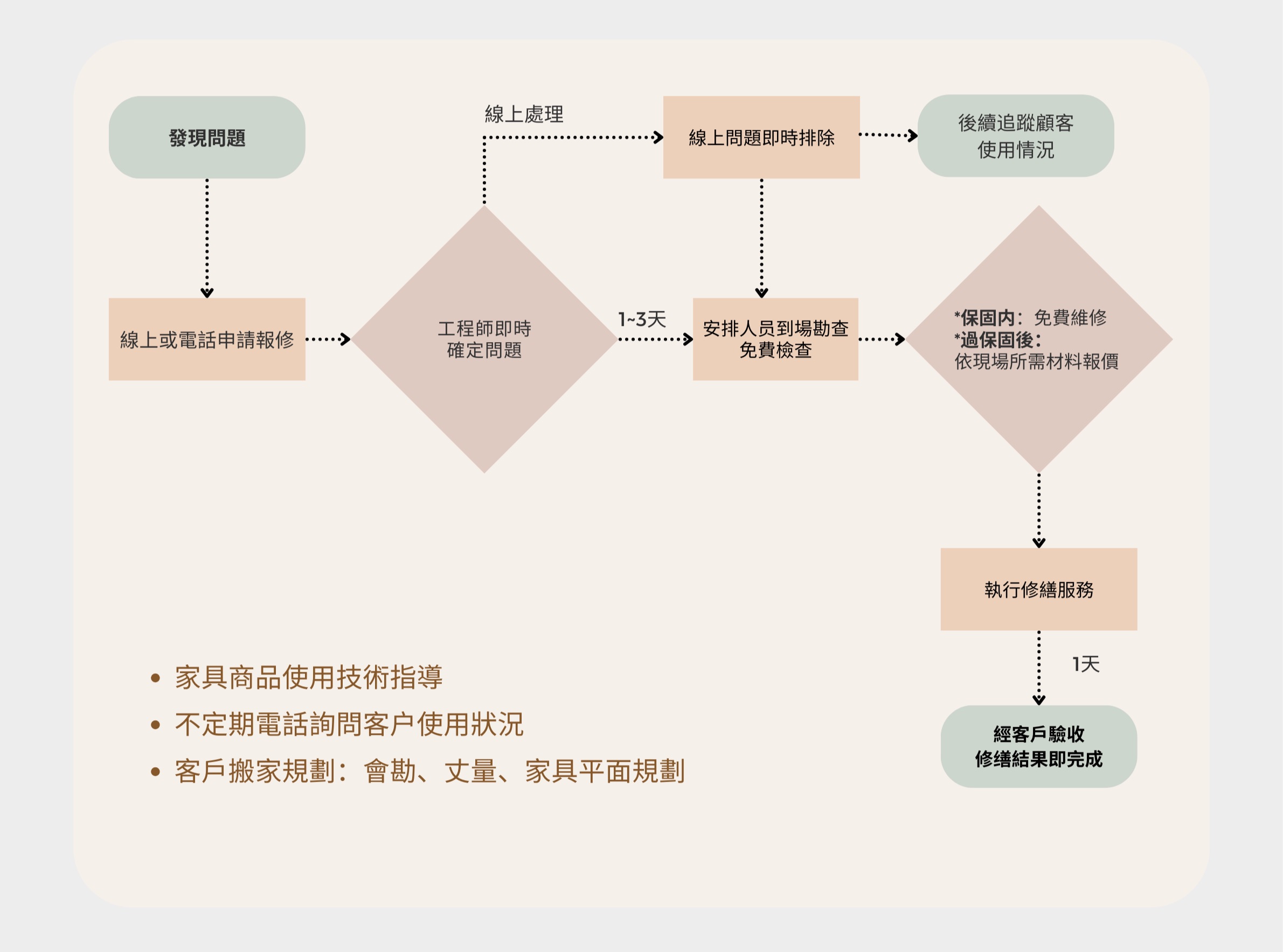 家具商品有損壞或使用問題可電話叫修,專案人員會在24小時内回覆與了解,並安排後續處理事項。